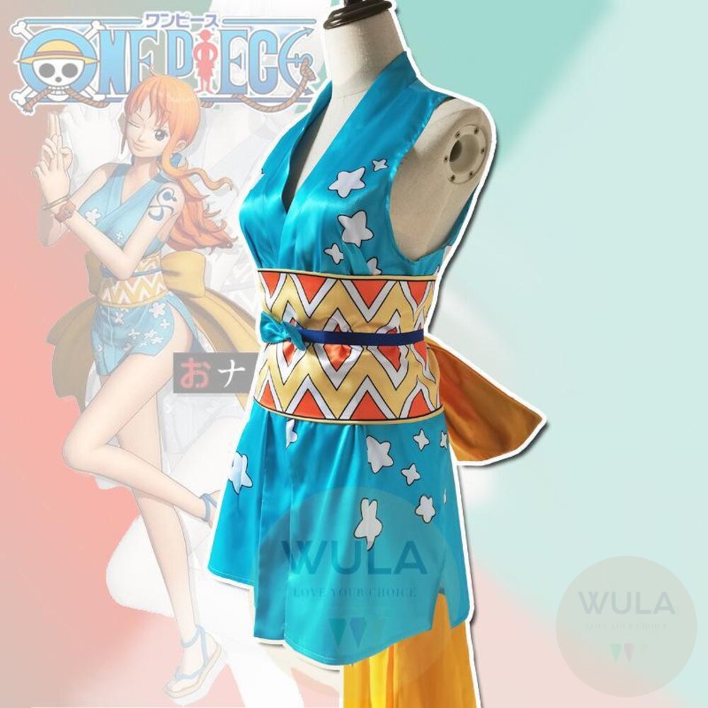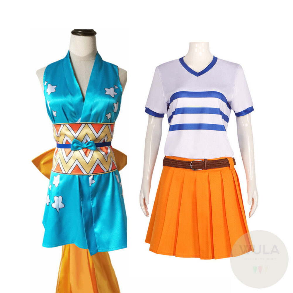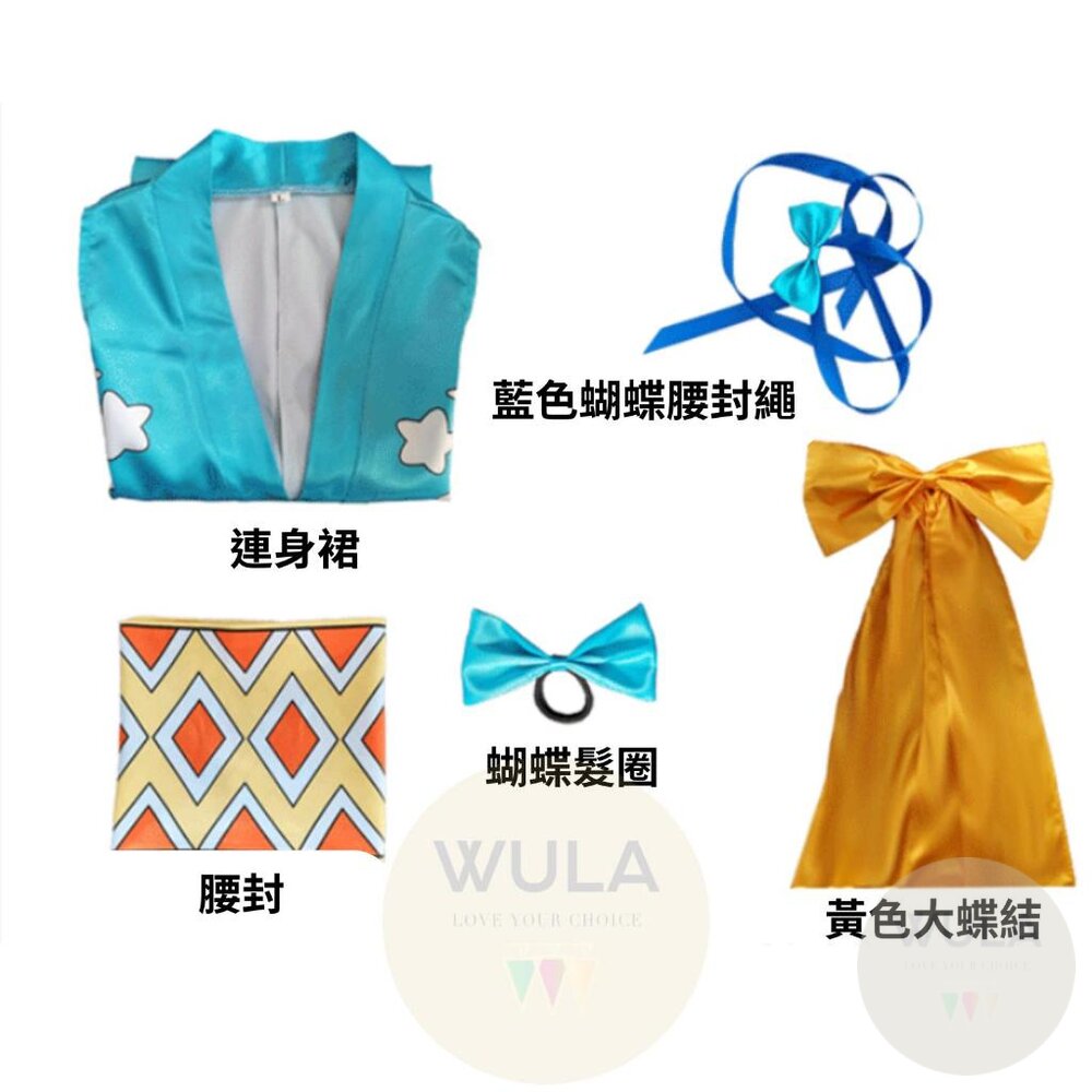 名稱:航海王-娜美 款式: ▸百褶裙款 ▸蝶結款 百褶裙款內容物:1.上衣 2.裙子 3.腰帶 蝶結款內容物:1.連身裙 2.腰封 3.藍色蝴蝶腰封繩 4.黃色大蝶結 5.蝴蝶髮圈