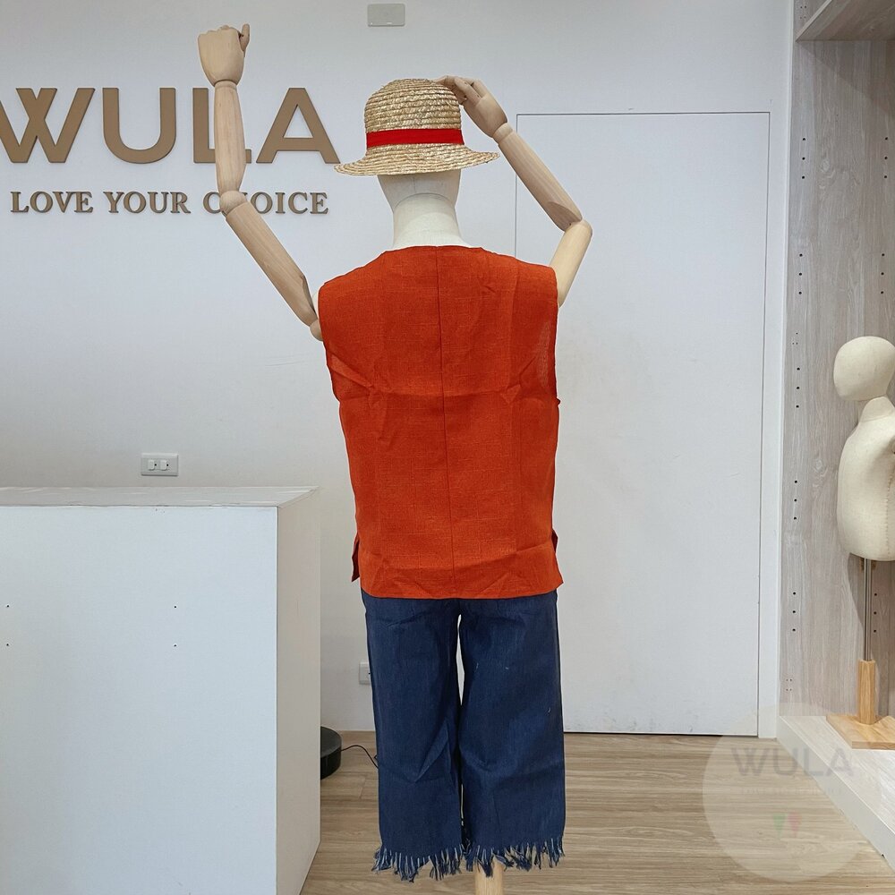名稱:魯夫無袖套裝-大人版 材質:牛仔布、棉麻 款式: ▸套裝 ▸套裝+草帽 草帽尺寸:建議頭圍在60公分內配戴