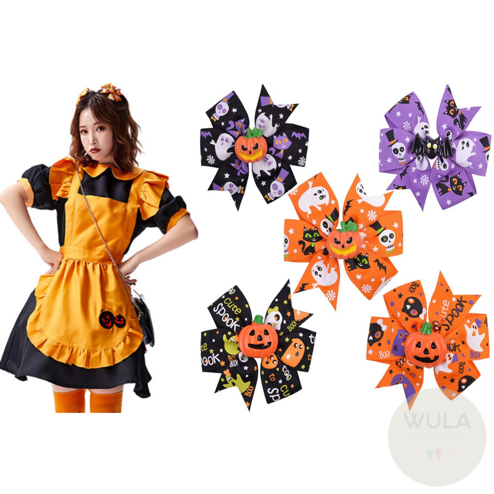 名稱:南瓜蝙蝠髮夾 款式: 》南瓜幽靈 》南瓜黑貓 》紫色蝙蝠 》搖滾幽靈 》搖滾紫貓 材質:滌綸螺紋 尺寸: 蝴蝶結約8*8cm 夾子約4.6cm