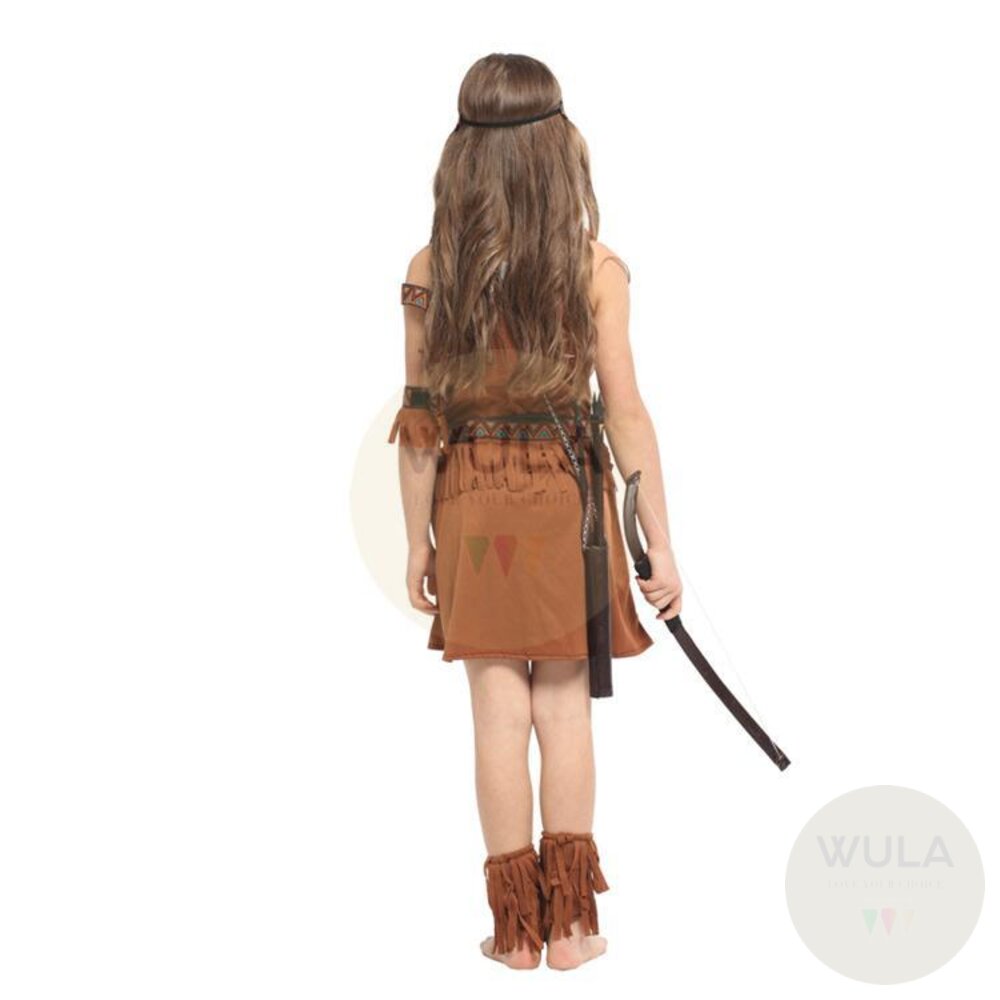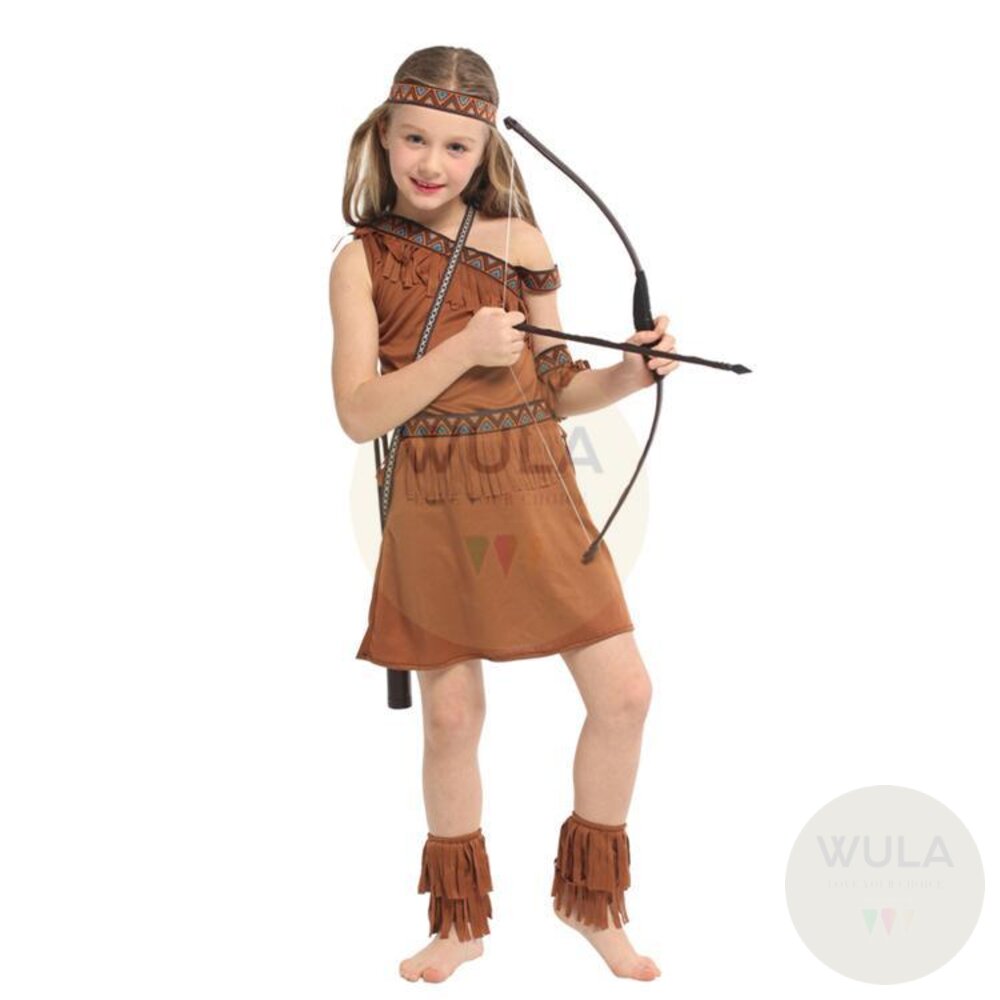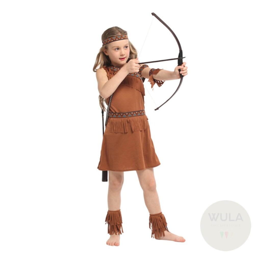 名稱:印地安人(兒童版) 服裝內容物:連身裙、頭飾、腰飾、臂飾、腳飾*2 玩具弓箭組內容物:弓、吸盤箭*3 尺寸:弓箭長約40cm