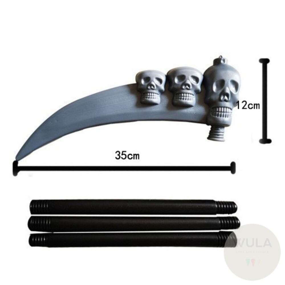 名稱:死神骷顱套裝 兒童四件組內容物:1.披風 2.面巾 3.夜光手套(雙) 4.骷顱頭鐮刀 大人四件組內容物:1.披風 2.面巾 3.夜光手套(雙) 4.骷顱頭鐮刀 尺寸: 兒童版披風長-91cm 大人版披風長-135cm 骷顱頭鐮刀長-92cm