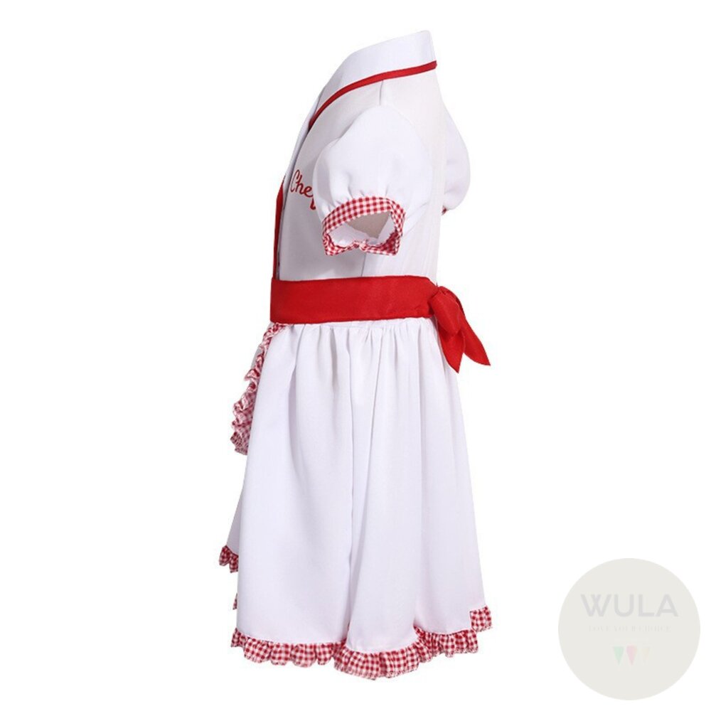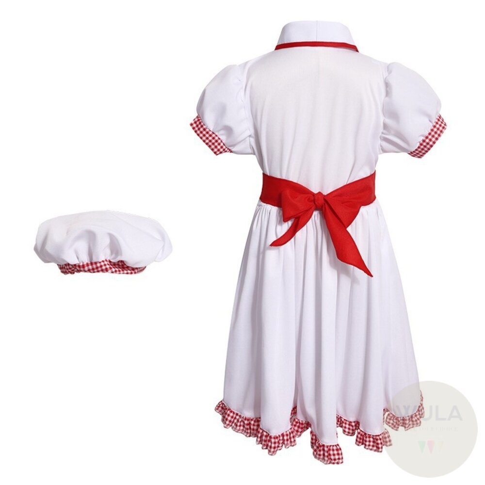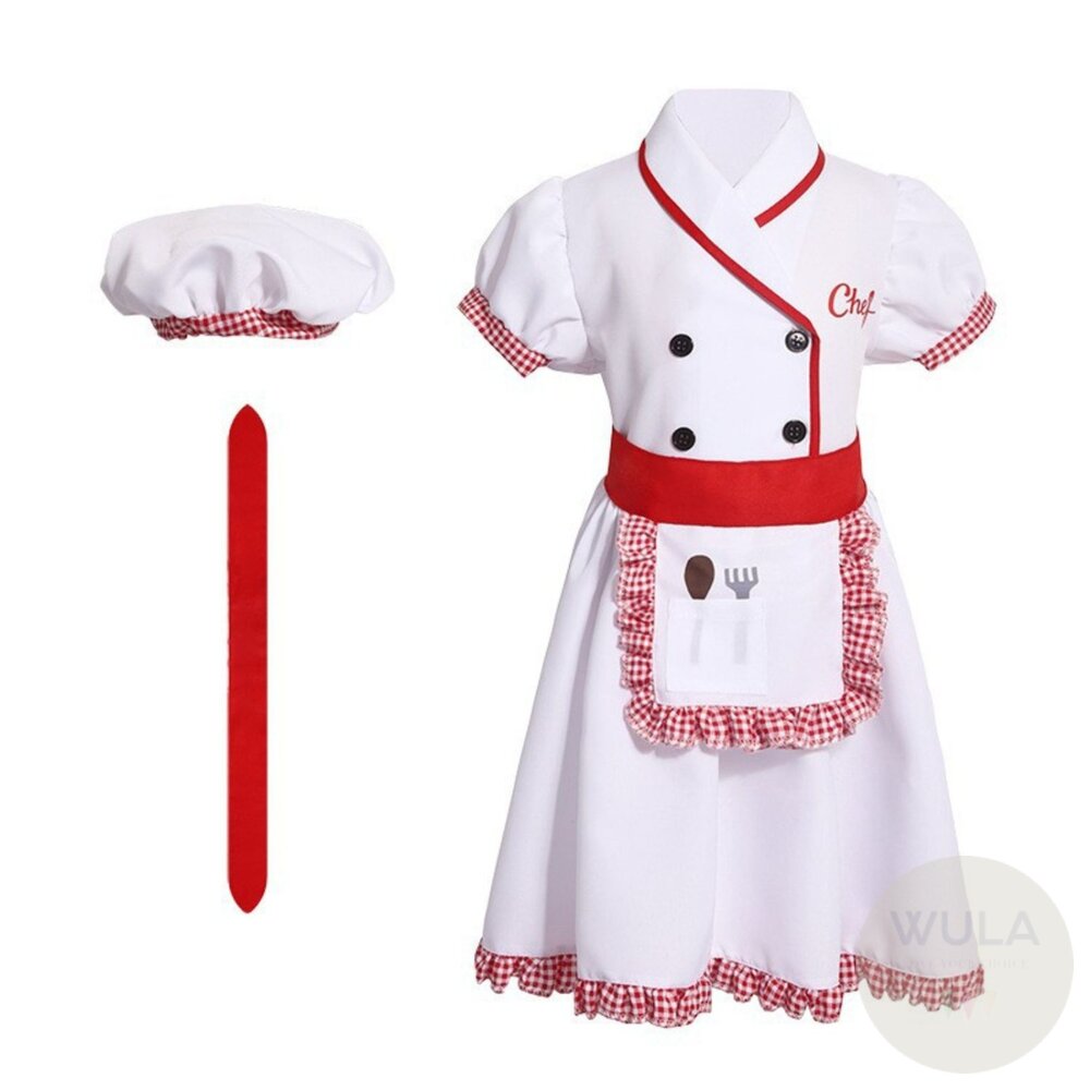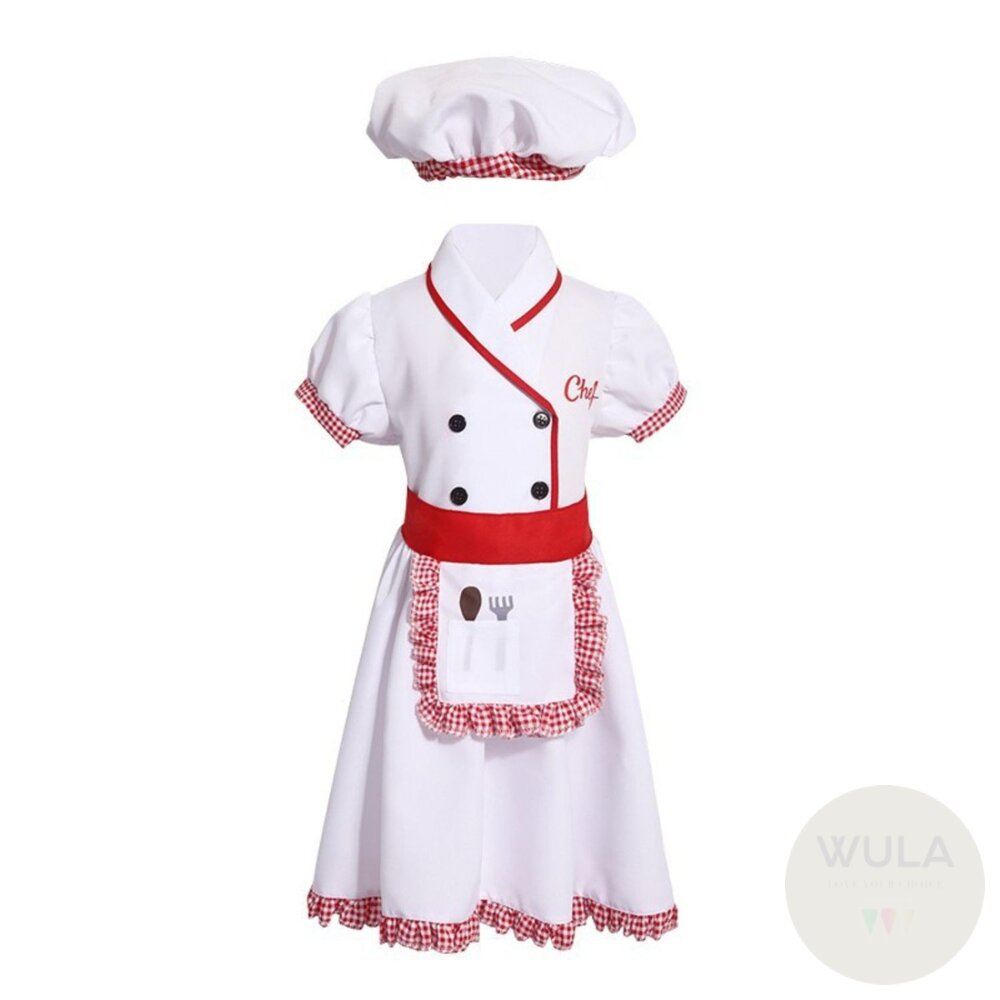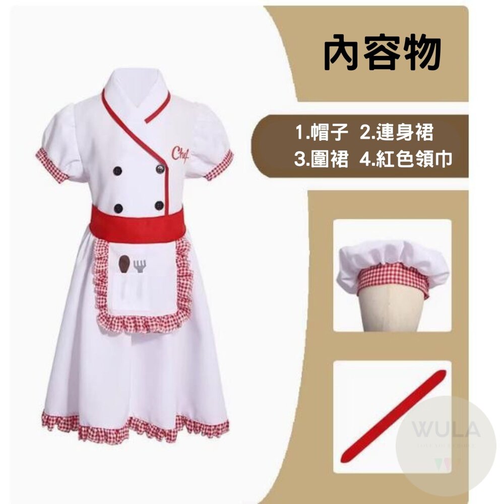 名稱:甜點烘焙師服裝 內容物:1.帽子 2.連身裙 3.圍裙 4.紅色領巾
