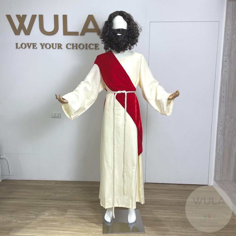 名稱:耶穌基督傳教士 服裝內容物:1.連身衣 2.披肩 3.腰繩 材質:制服呢、絨布 披肩尺寸:23.5*208cm 大鬍子假髮內容物:1.假髮 2.假鬍鬚(可拆式)