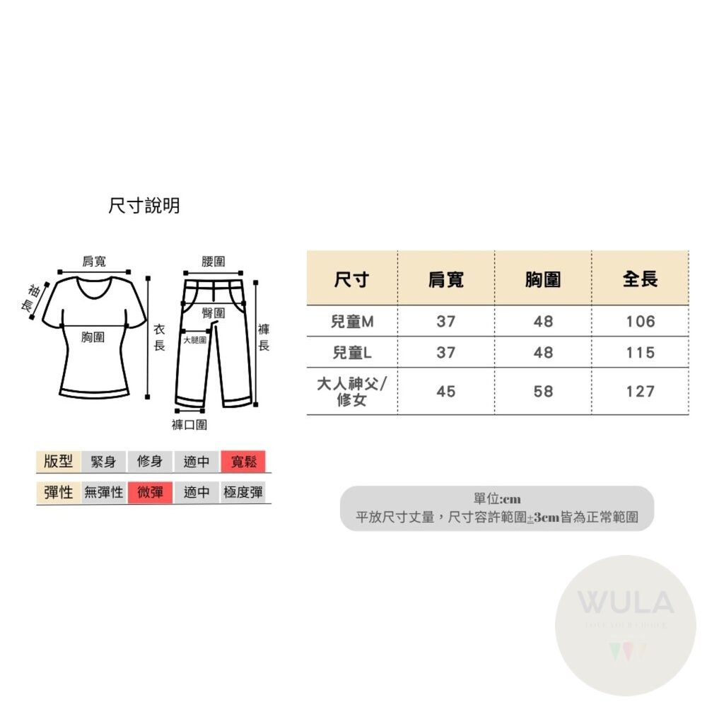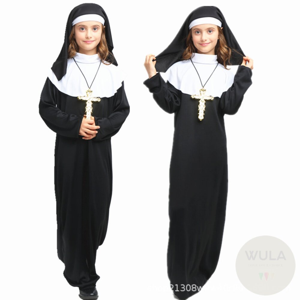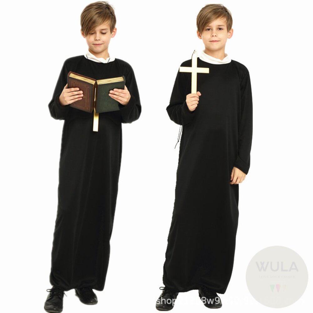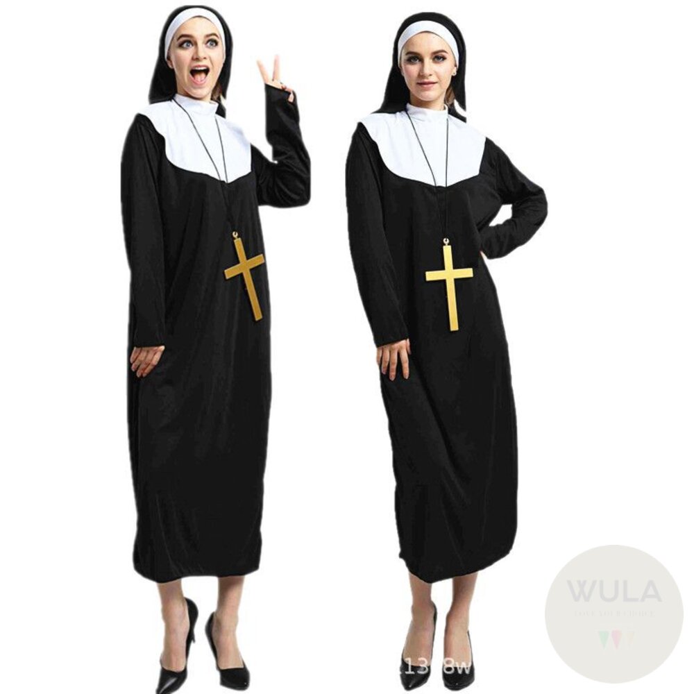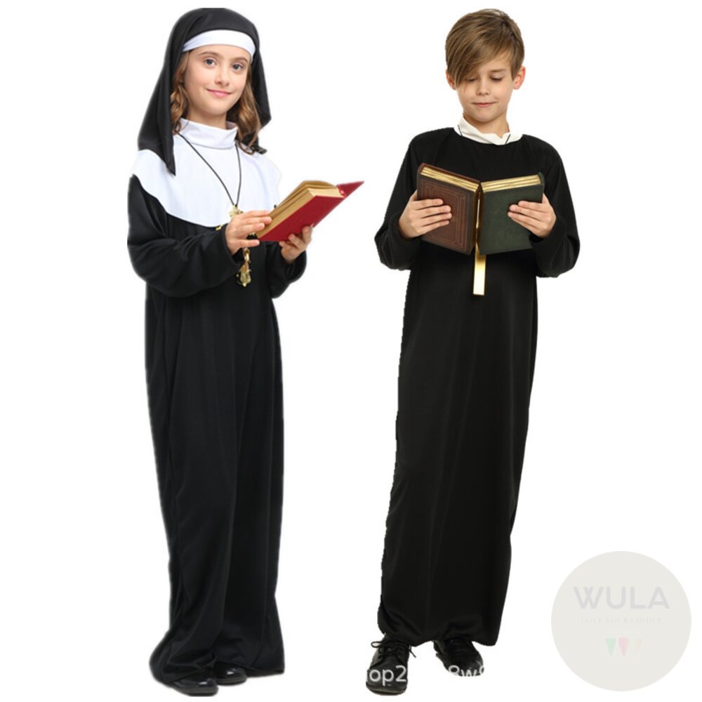 名稱:修女神父服裝 修女內容物:1.連身衣 2.頭巾 3.十字架項鍊 神父內容物:1.連身衣 2.十字架項鍊