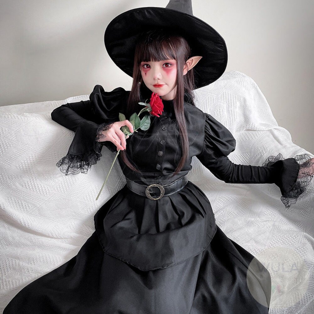 ★Model裙擺的蓬度是搭配襯裙「大人-長版(綁繩)」的效果 名稱:澎袖蕾絲黑女巫 服裝材質:聚酯纖維 服裝內容物:1.連身裙 2.女巫帽 3.腰帶