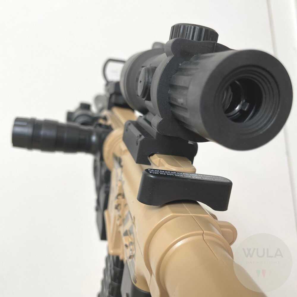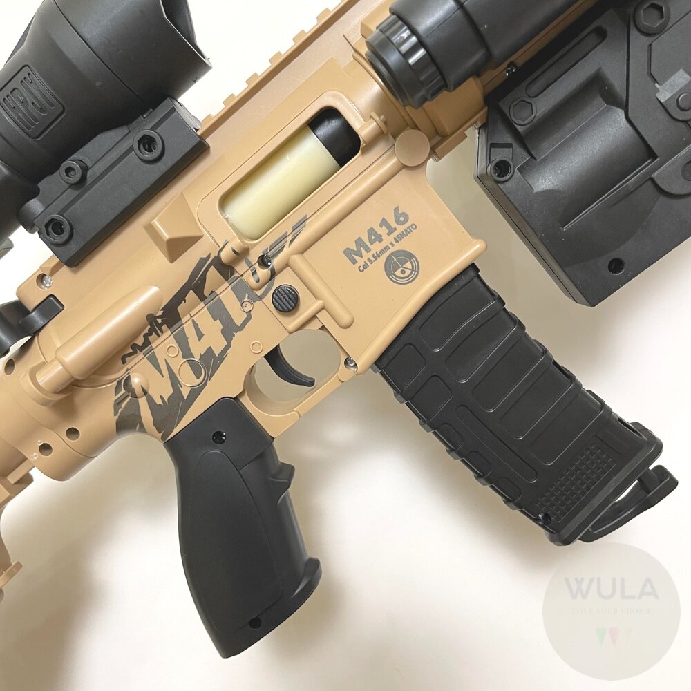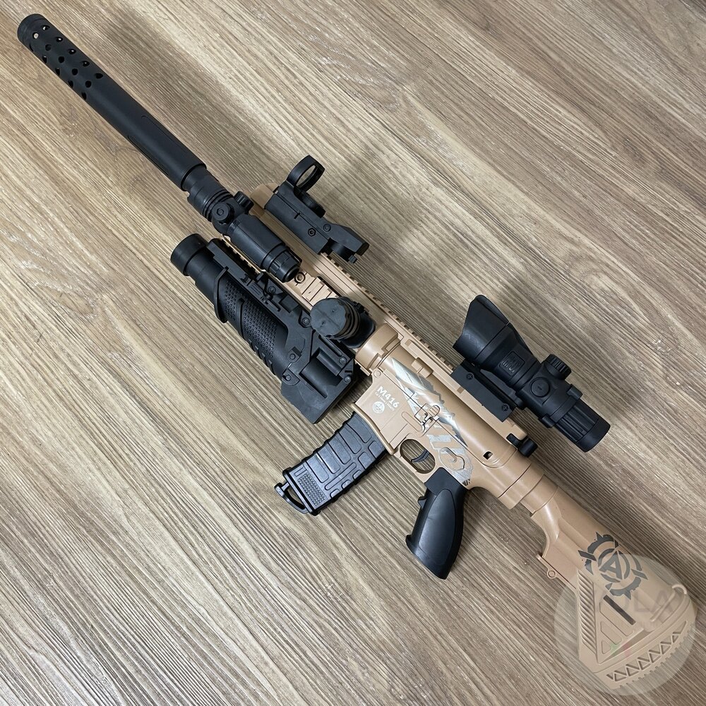 ▲零件需自行組裝 名稱:M416玩具步槍 尺寸:全長77cm 內容物:1.道具彈殼*10 2.道具軟殼*10 3.四點瞄準器 4.倍鏡 5.消音器 6.握把 7.直角握把 8.槍體 9.槍托 10.榴彈炮 11.紅外線 12.手電筒 13.彈夾