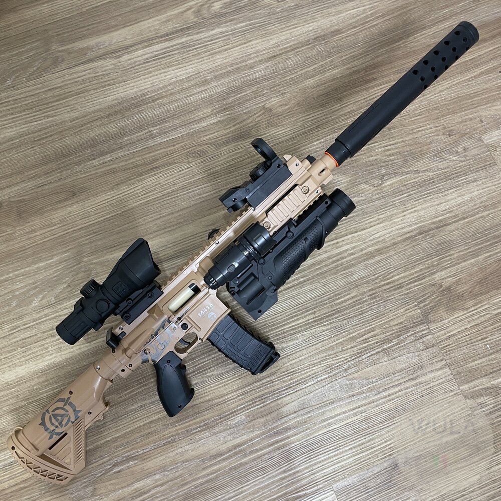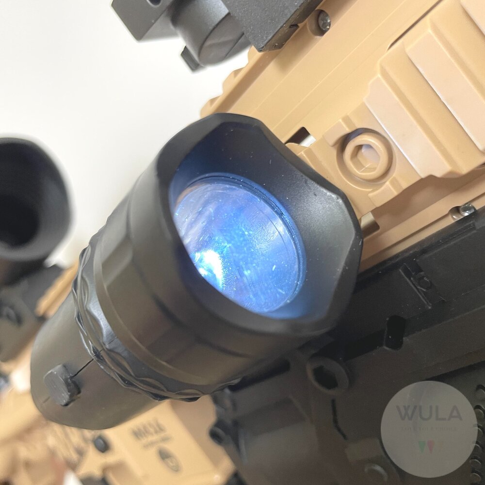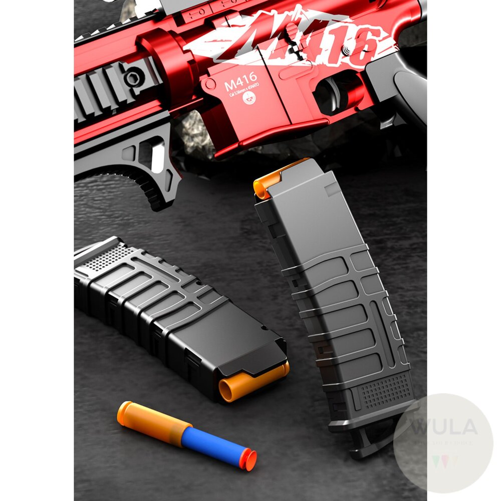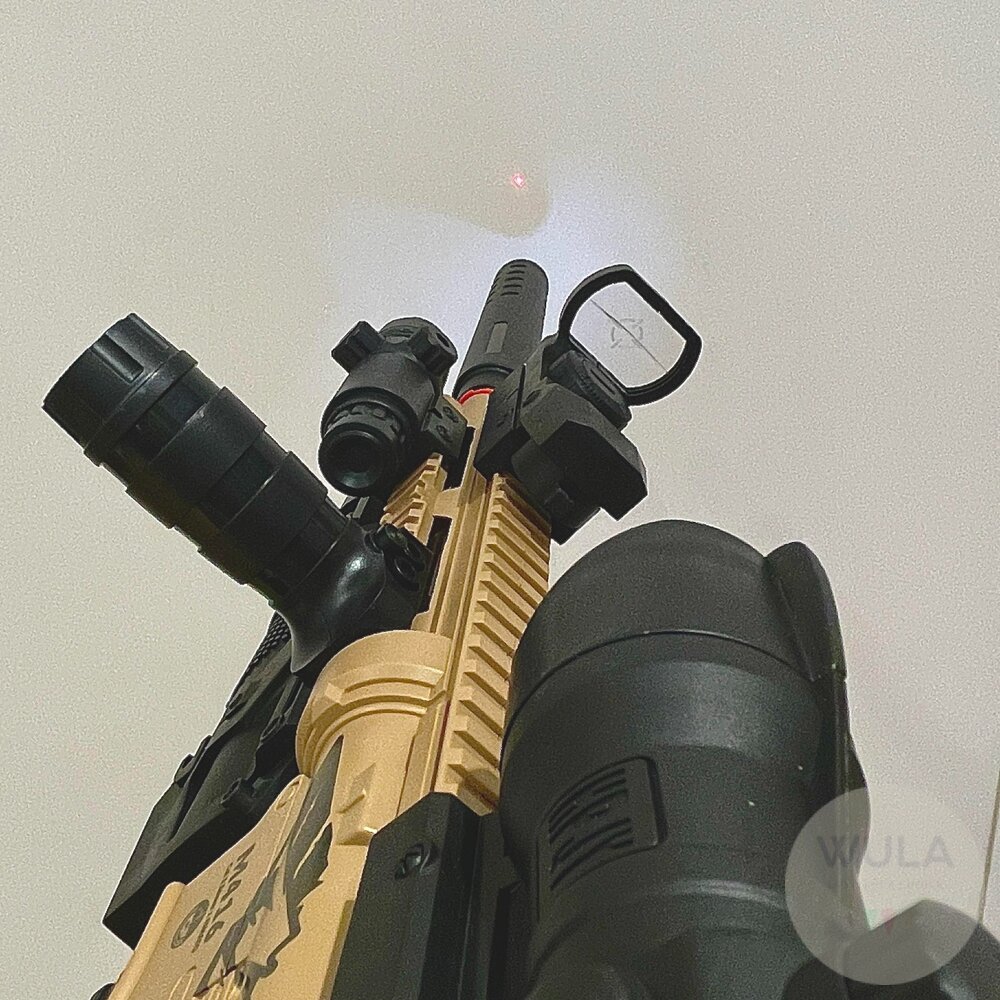 ▲零件需自行組裝 名稱:M416玩具步槍 尺寸:全長77cm 內容物:1.道具彈殼*10 2.道具軟殼*10 3.四點瞄準器 4.倍鏡 5.消音器 6.握把 7.直角握把 8.槍體 9.槍托 10.榴彈炮 11.紅外線 12.手電筒 13.彈夾