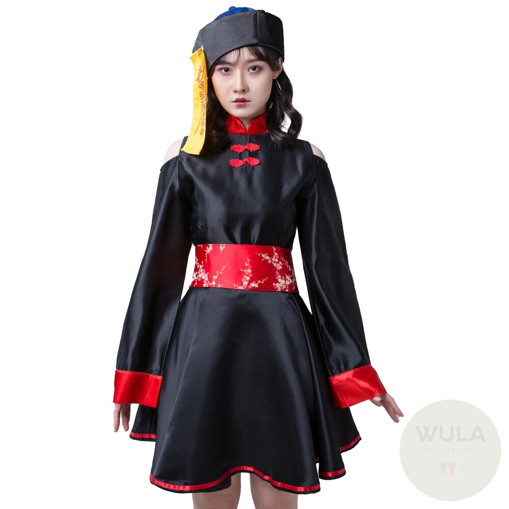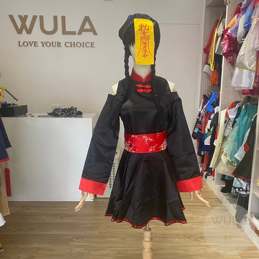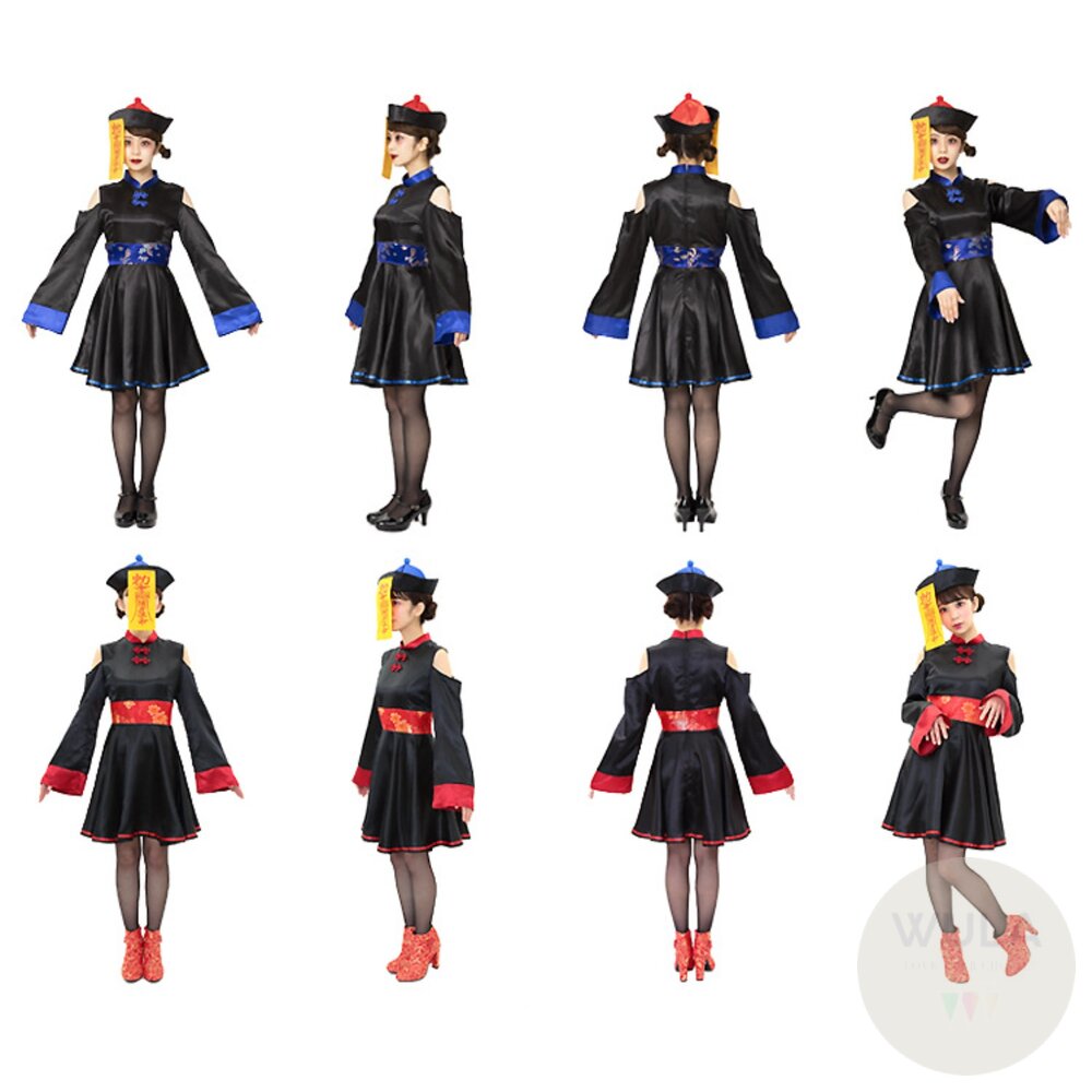 名稱:旗袍女殭屍(大人版) 材質:滌綸 內容物:1.連身裙 2.腰布 3.帽子 4.符咒道具 平放測量尺寸:肩寬43cm, 胸寬45cm, 腰寬38cm, 全長85cm