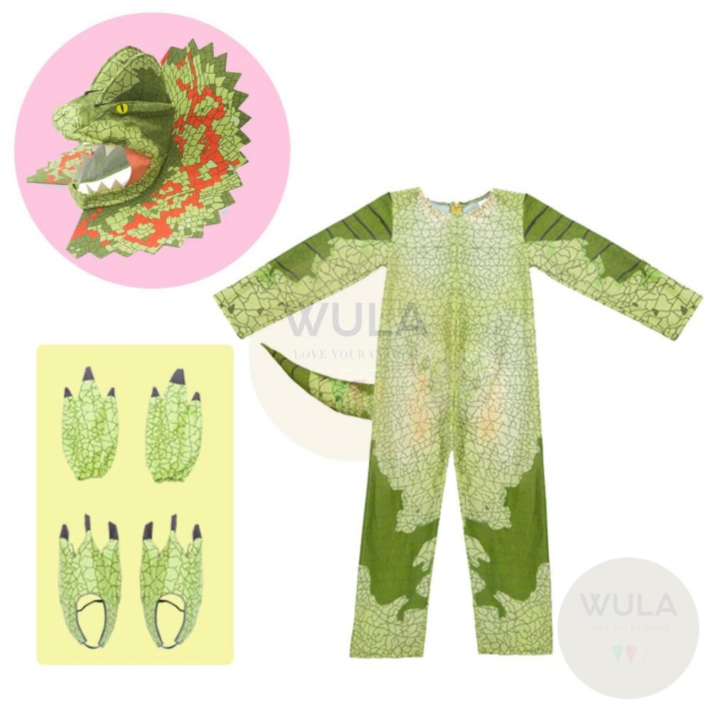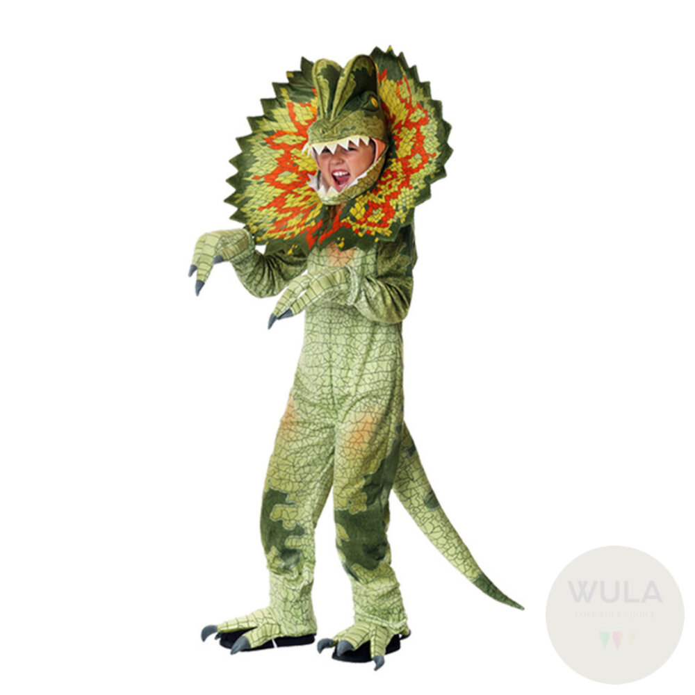 名稱:侏羅紀公園-傘蜥蜴(兒童版) 材質:滌綸 內容物:1.連體衣 2.頭套 3.手套(雙) 4.腳套(雙)