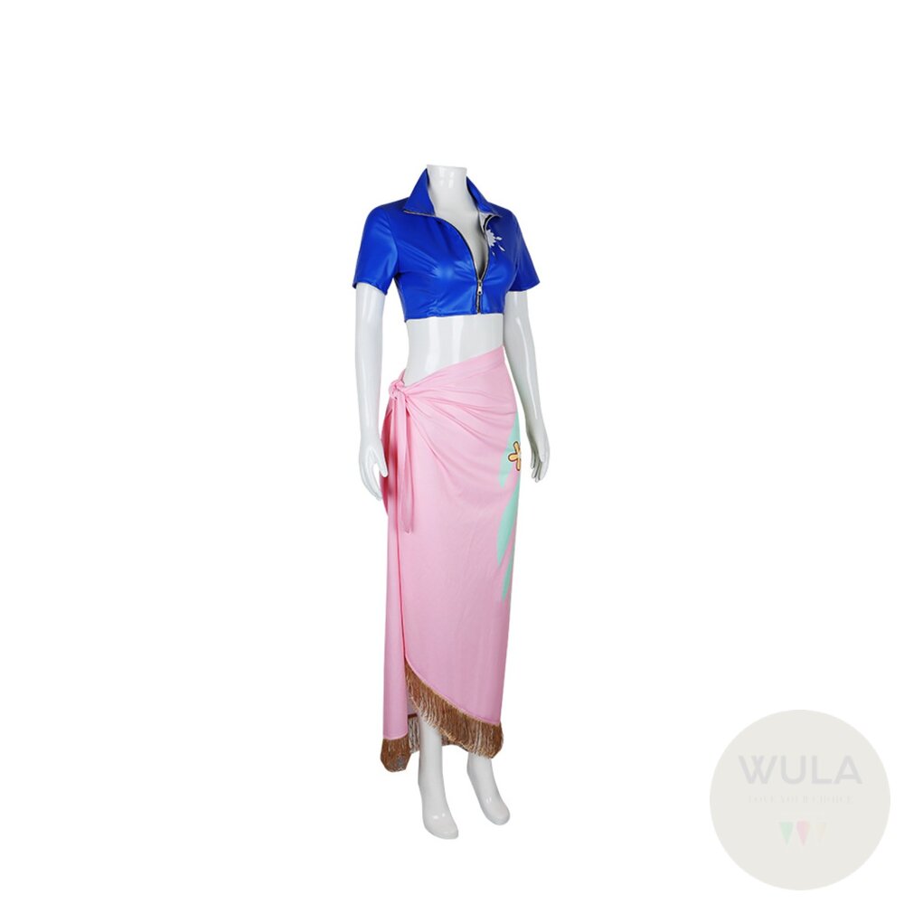 名稱:航海王-妮可羅賓(藍皮衣款) 內容物:1.皮上衣 2.綁帶長裙