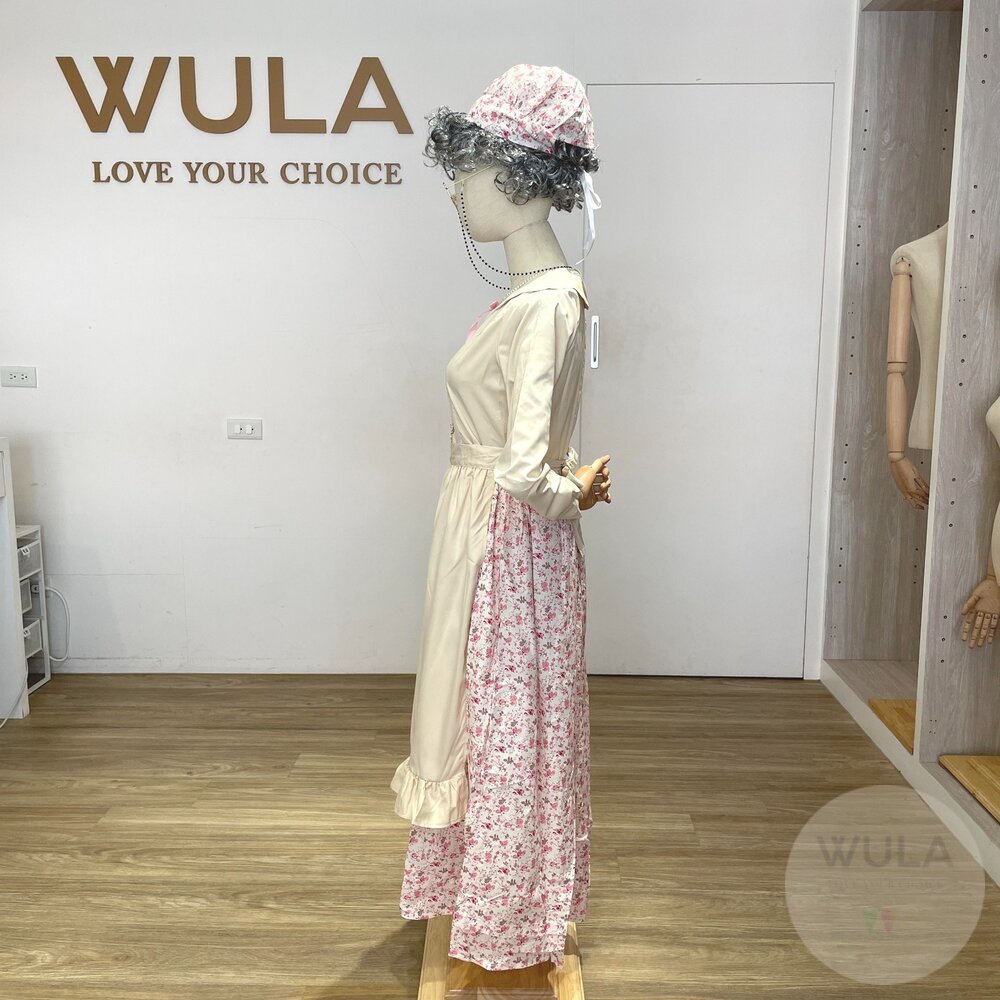 名稱:老奶奶碎花裙 材質:滌綸 服裝內容物:1.碎花裙 2.圍兜 3.頭巾 配件組內容物:1.捲髮假髮 2.眼鏡 3.眼鏡鍊 4.珍珠項鍊 5.髮捲*4 6.髮網