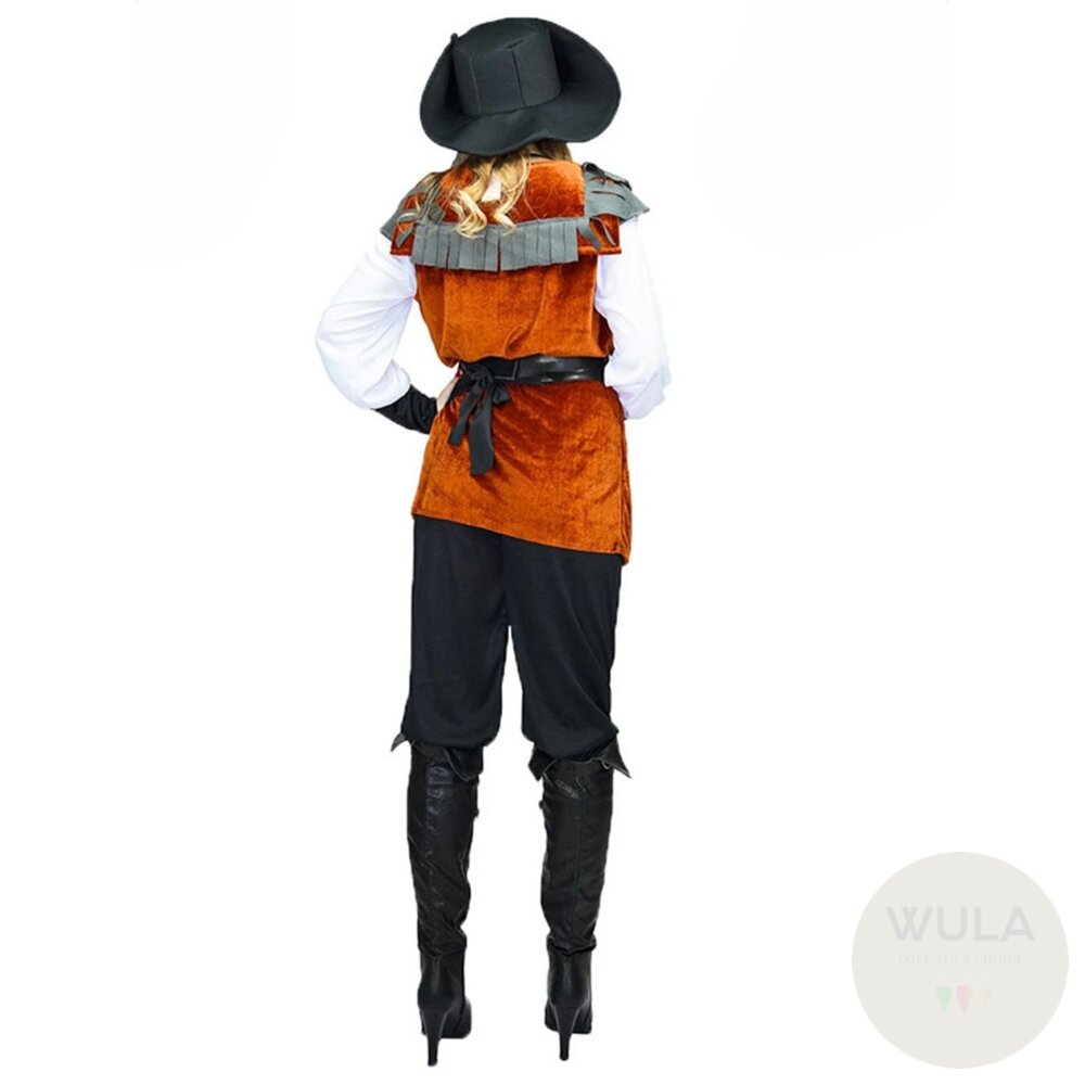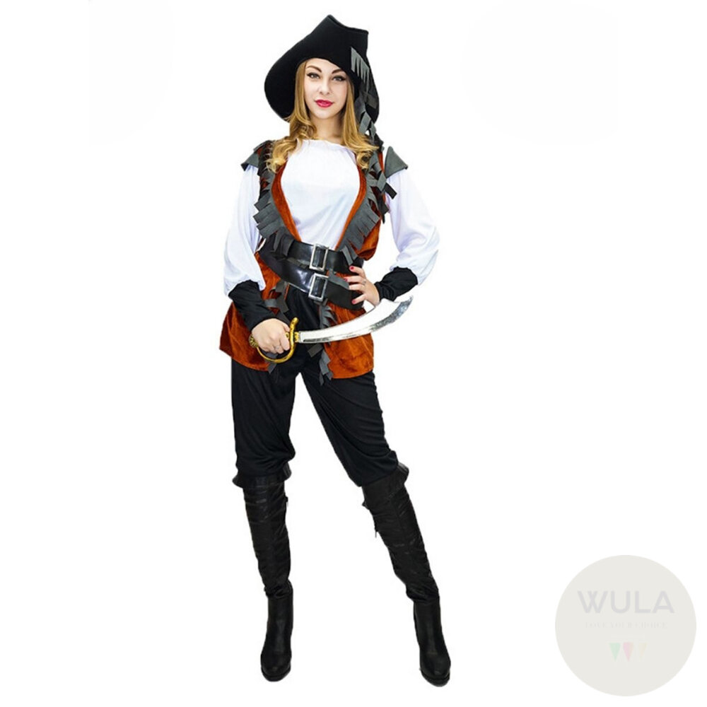 名稱:棕色流蘇女海盜 內容物:1上衣 2.褲子 3.背心 4.腰帶*2 5.腿套(雙) 6.帽子