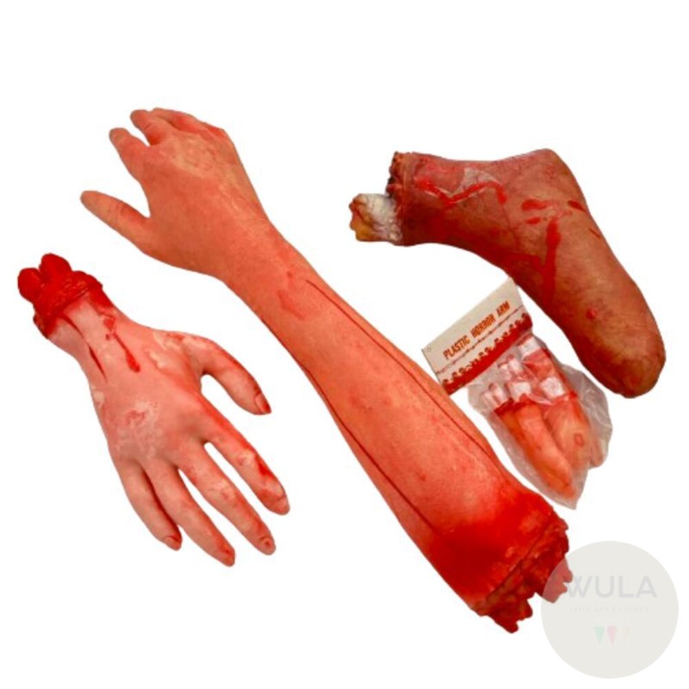 名稱:仿真斷手腳道具 材質:乳膠、內部PP棉填充 尺寸: ▸手指頭-長度10cm ▸斷腳-長度22cm ▸大斷手臂-長度45cm ▸斷手-長度24cm ▸斷手臂-約30cm*13cm ▸大斷腿-約54cm*23cm ▸斷指手-約22cm*10cm
