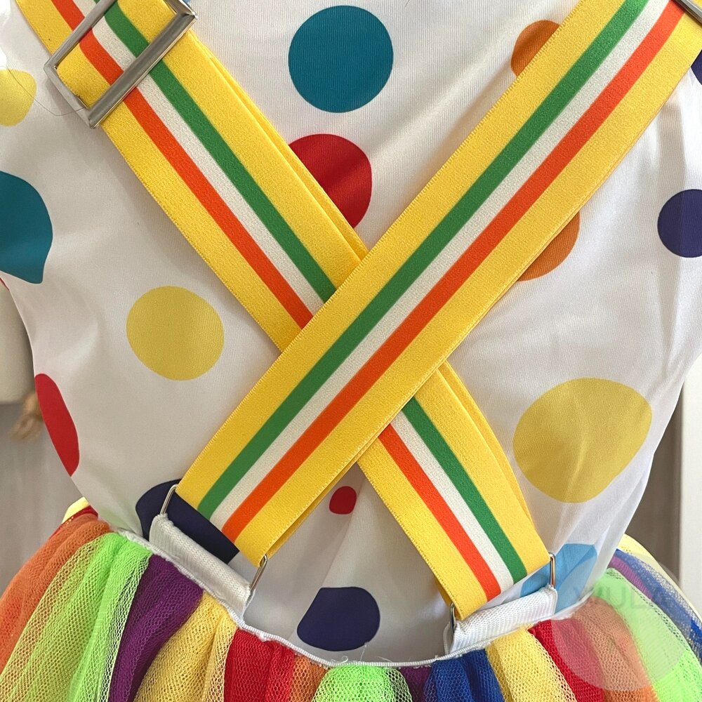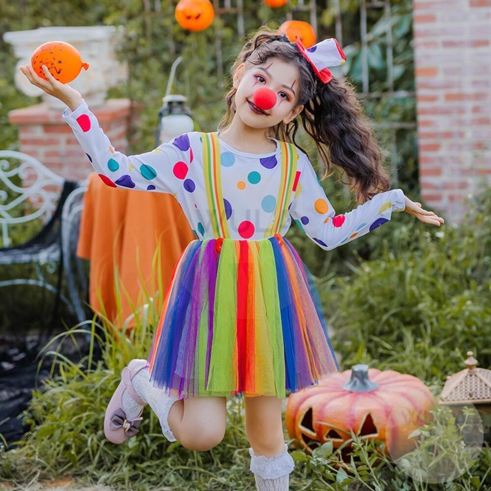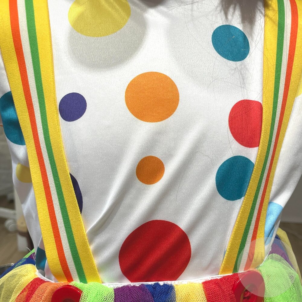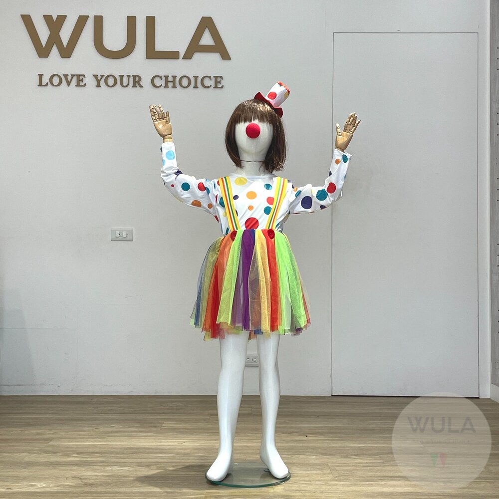 名稱:點點小丑裝(兒童版) 材質:聚酯纖維 內容物:1.上衣 2.吊帶裙 3.小帽子夾飾 4.小丑鼻 5.襪子