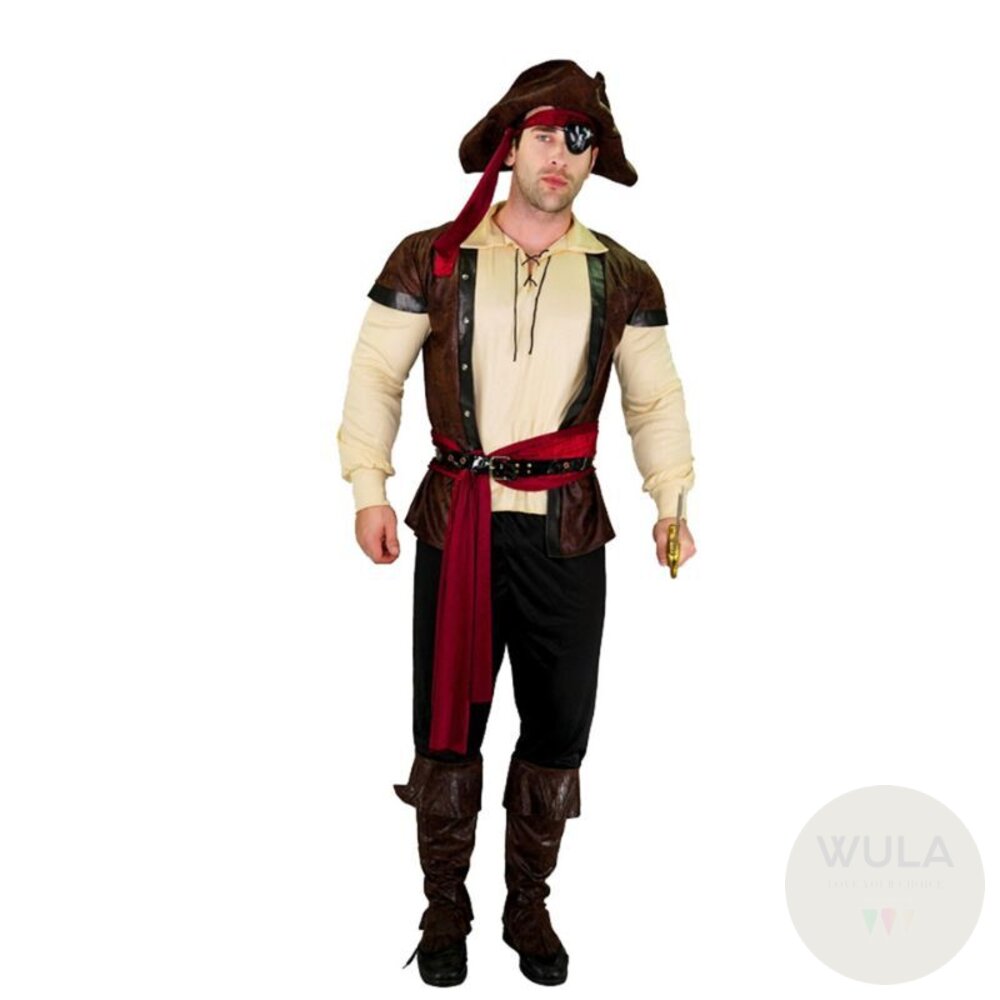 名稱:皮革海盜服 內容物:1.上衣 2.褲子 3.皮帶 4.帽子 5.獨眼罩 6.靴套(雙) 7.腰布 8.頭巾