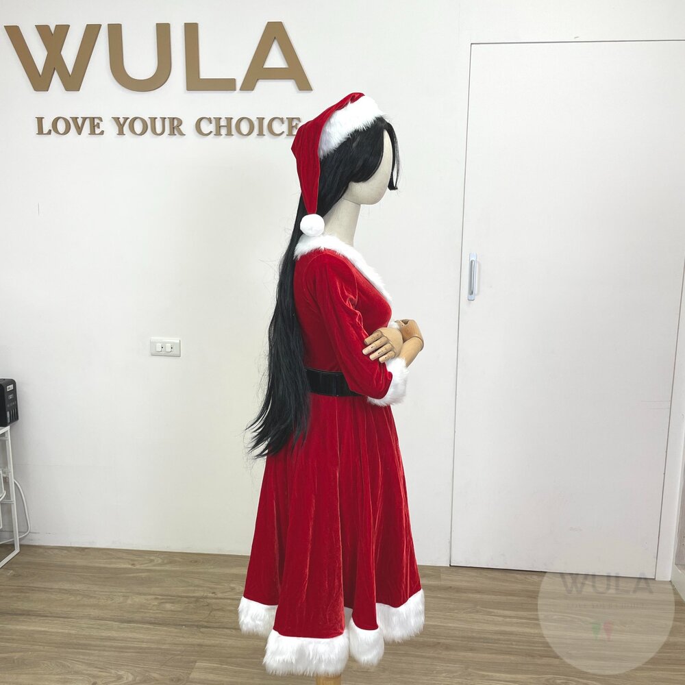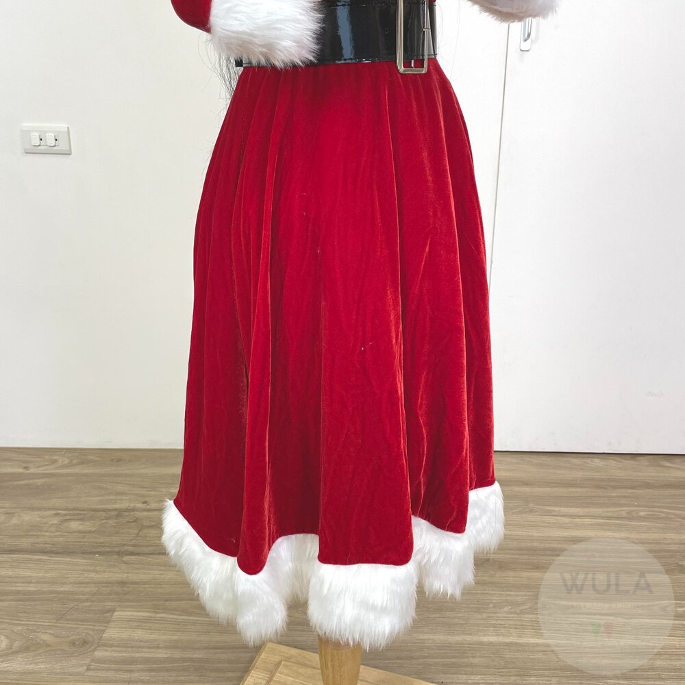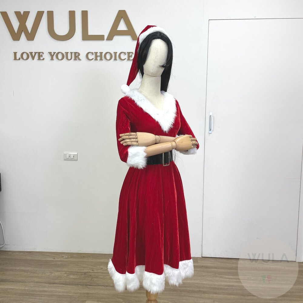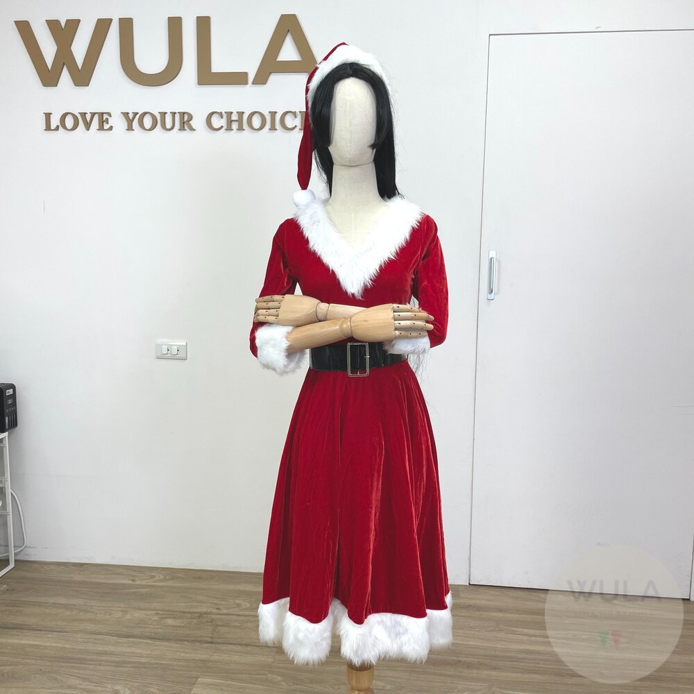 名稱:七分袖V領聖誕裙 內容物:1.連衣裙 2.腰帶 3.聖誕帽