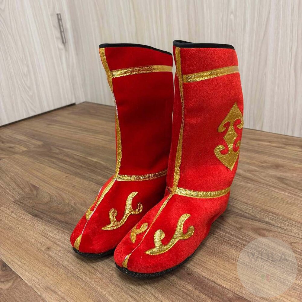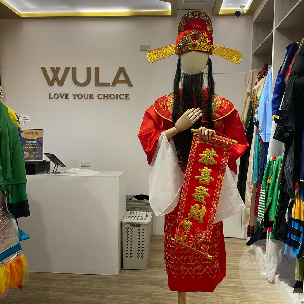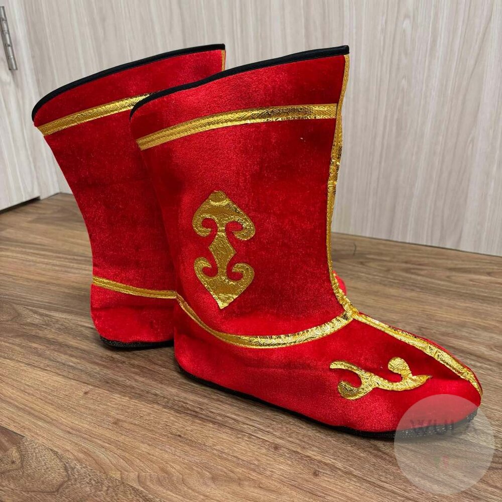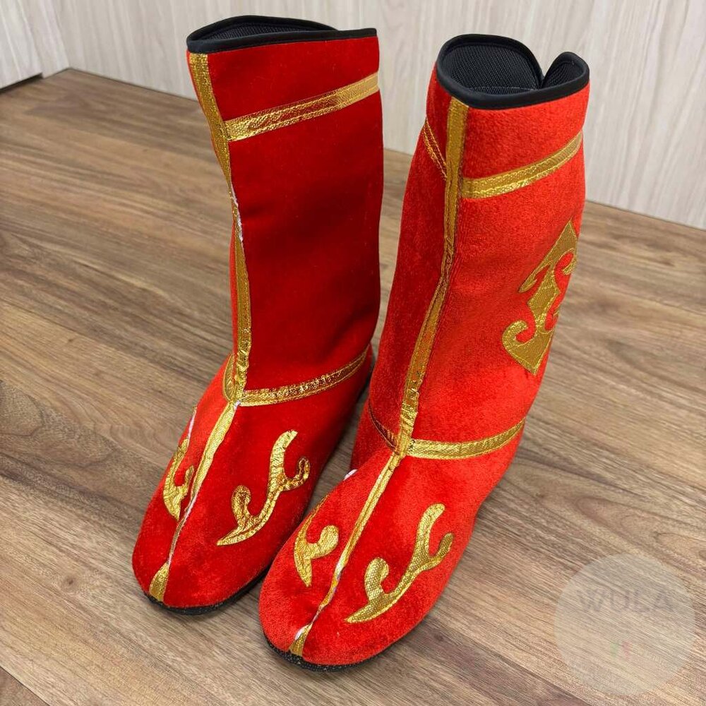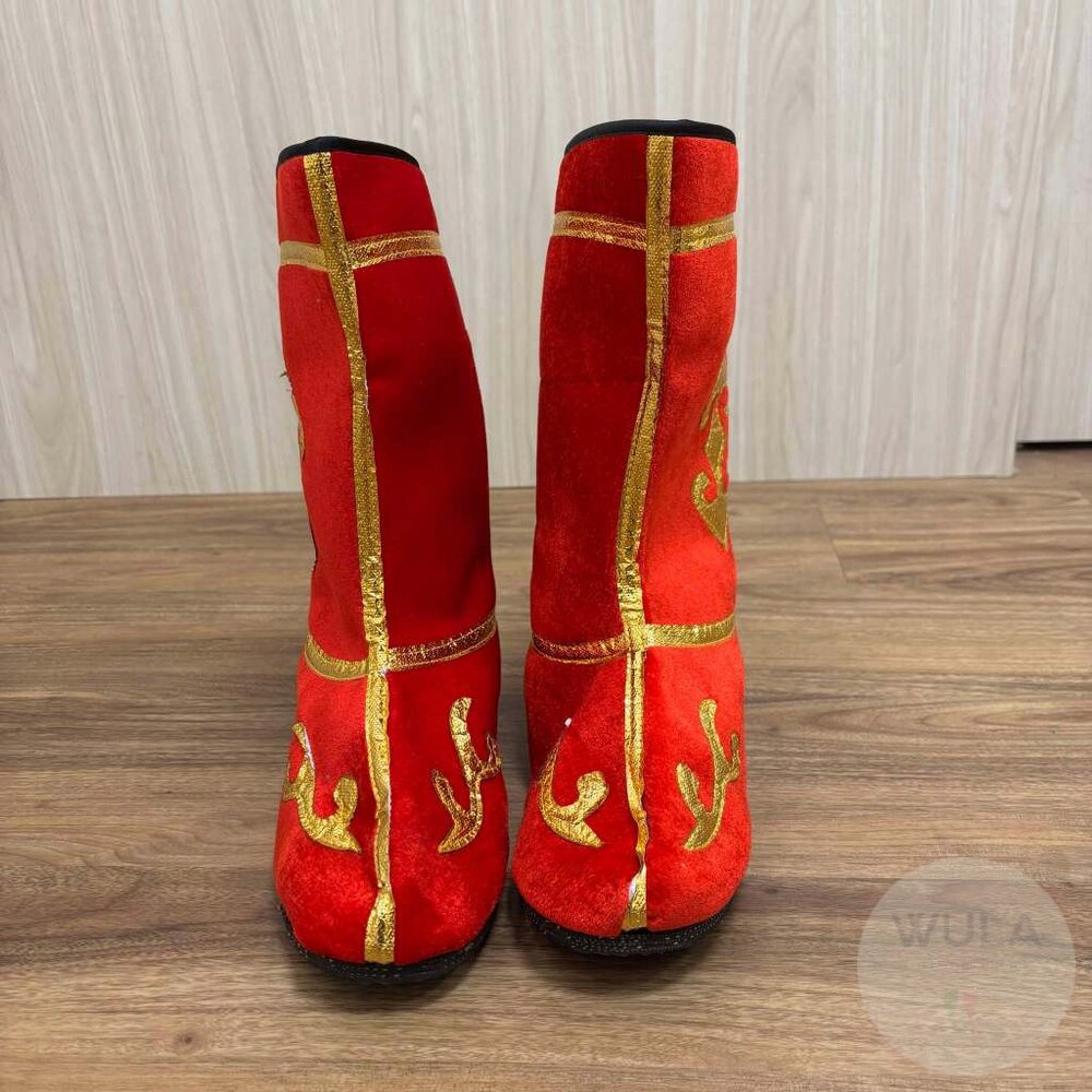 名稱:財神爺服 服裝內容物: 1.長袍 2.披肩 3.腰帶 4.鬍子 5.金元寶 6.帽子 7.翹翅仔*2 8.掛軸 古代紅靴尺寸:筒高30公分