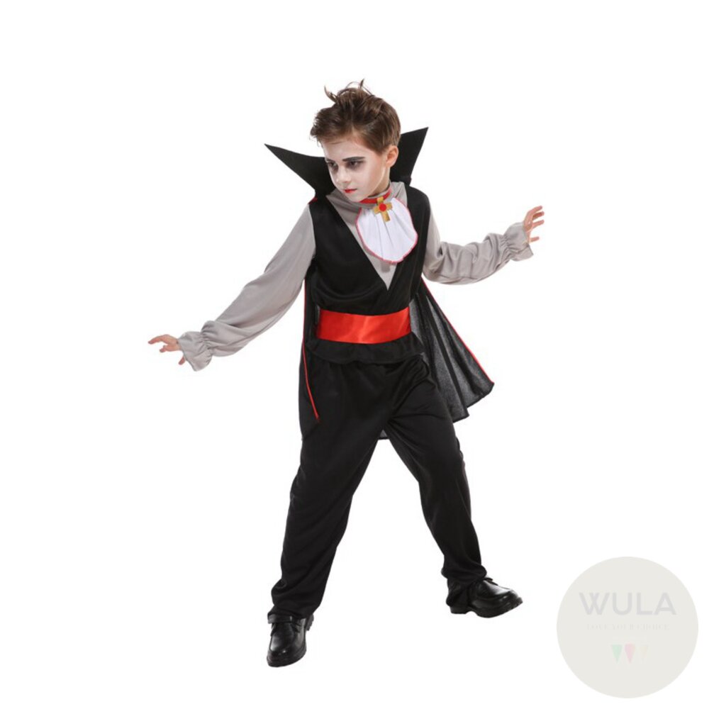 名稱:吸血鬼王子(兒童版) 材質:滌綸 內容物:1.上衣 2.褲子 3.腰帶 4.十字架頸飾 5.披風