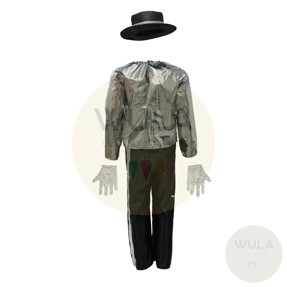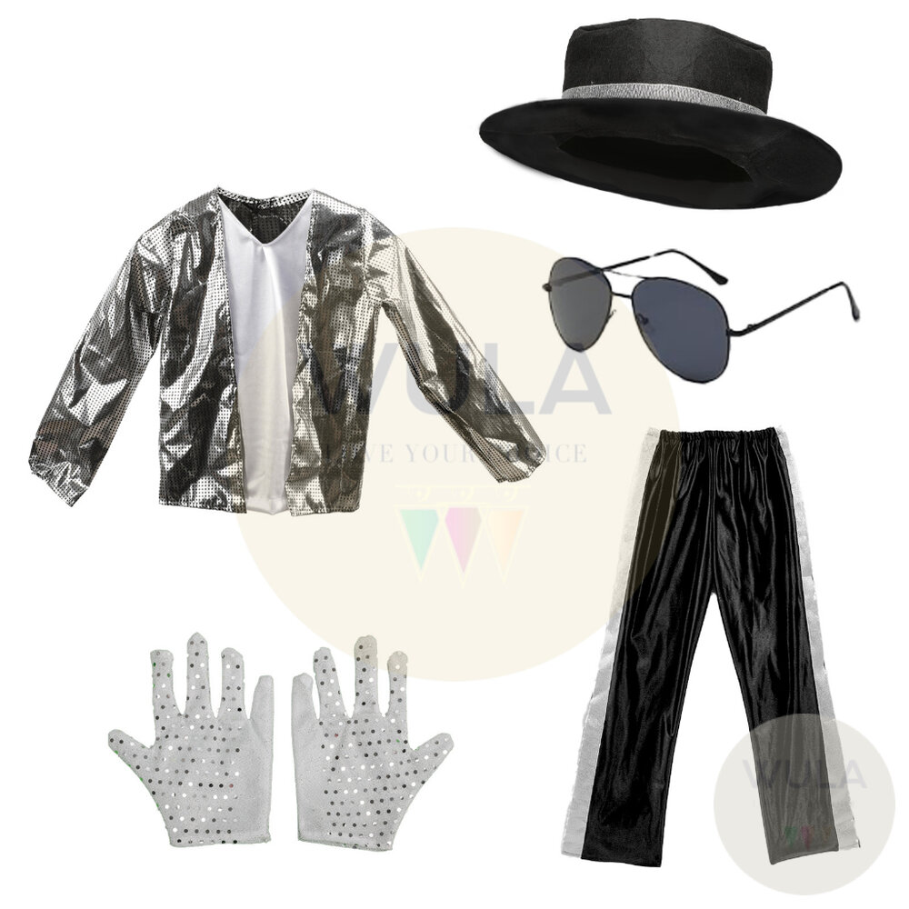 名稱:麥可傑克森表演服(兒童版) 內容物:1.上衣(含外衣) 2.褲子 3.帽子 4.手套(雙) 5.墨鏡
